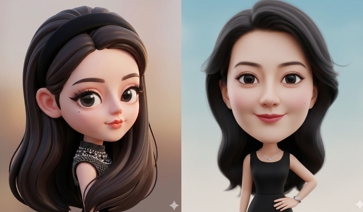 Cute 3D caricature of [name], giant head, small body, huge sparkling eyes, playful smile, exaggerated proportions, super smooth skin, pastel colors, soft rim lighting, Disney Pixar style, clean minimal background, adorable and charming, highly detailed --ar 3:4 --stylize 600