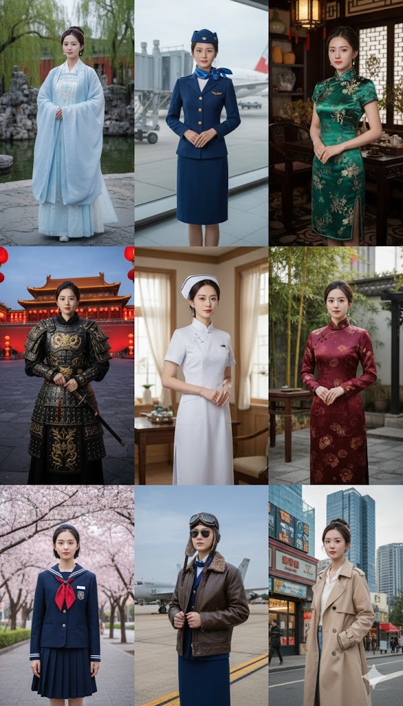 随着AI图像生成技术的快速发展,可以轻松基于一张人物照片生成多种服装风格的变体,并保持面部特征高度一致,展示同一人物在9种不同服装风格下的样子。整体风格统一为电影感光影、细节精致、色彩和谐,宽高比9:16(竖版,适合手机全屏查看)。