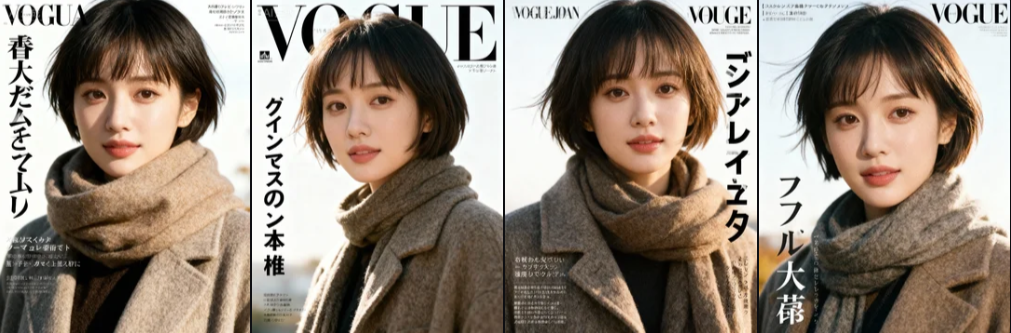 Keep the same person as the reference photo, maintain facial structure and identity, East Asian female, short bob haircut with airy bangs, natural makeup, realistic skin texture, consistent appearance across all photos.