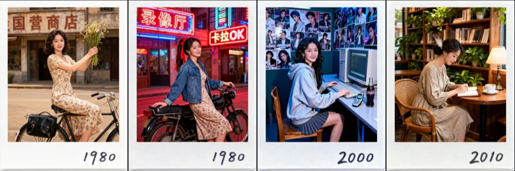 重新塑造成身处经典年代的形象照片,自然地融入当时的服装、发型、动作、场景和风格,比如身处1970年代。