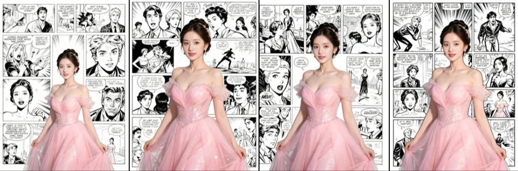 从上传的图像中提取的中心人物以完整、充满活力的逼真色彩和清晰的细节呈现。它们被戏剧性地照亮,非常引人注目。背景是一幅细节复杂、多面板的黑白漫画,完全无字,充满了直接以中心人物为主角的幽默、夸张的叙述。这些漫画面板不仅应该以有趣、轻松或略显荒诞的场景来描绘主题,而且还应将中心人物无缝地融入周围的漫画世界。色彩缤纷的主要主题应该看起来好像他们是这个动态的、单色喜剧现实的一个组成部分,也许是“走出”或“冻结在”特定的漫画面板中,他们的姿势和表情直接与周围的黑白叙事互动。漫画面板以经典、高对比度的漫画风格绘制,线条大胆,并创造性地排列,​​创造出一个具有凝聚力和吸引力的叙事背景,强烈地吸引观众的注意力。