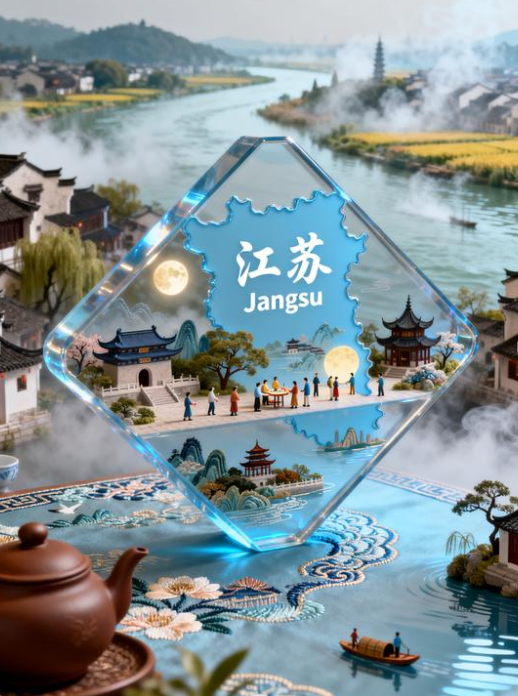 横放菱形透明盒,3:4,8K,魔幻写实,中秋夜,内部微缩:南京中山陵台阶映月、苏州拙政园曲桥灯笼、连云港花果山水帘洞小猴提月、徐州云龙湖音乐喷泉,小人儿泛舟、赏桂花、放兔灯,表面淡蓝磨砂玻璃+白字“江苏 Jiangsu”,背景长江水汽与阳澄湖荷塘交织,材质:苏绣细腻纹理+宜兴紫砂颗粒,主灯柔和月白,局部南京云锦金丝反光,超高清,电影景深 --ar 3:4 --v 6