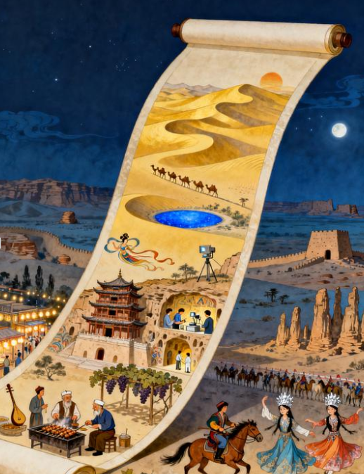 一副展开的卷轴倾斜而下,卷轴内是敦煌的微缩全景景观。鸣沙山如金色波浪绵延起伏,月牙泉似蓝宝石镶嵌其中,驼队影子在落日下被拉长。莫高窟九层楼巍然屹立,飞天壁画飘带轻盈舞动,研究员在洞窟内用光谱仪检测颜料成分。沙州夜市灯火初上,维吾尔族老人正在烤制羊肉串,葡萄架下传来冬不拉的弹奏声。玉门关遗址矗立在荒野中,汉长城如苍龙蜿蜒至天际,雅丹魔鬼城里风蚀岩柱在月光下如魔怪列队。赛马大会上,哈萨克骑手策马奔腾,彩袍在风中猎猎作响,姑娘们头顶银冠跳起旋舞。