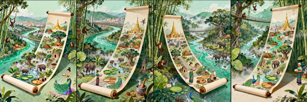 一副展开的卷轴倾斜而下,卷轴内是西双版纳的微缩全景景观。澜沧江如碧色绸带穿城而过,两岸热带雨林层叠绵延,望天树廊桥高耸入云,傣家竹楼在凤尾竹丛中若隐若现。景洪市大金塔在暮色中流光溢彩,总佛寺的贝叶经扉轻启,身着筒裙的傣家姑娘手捧莲花拾级而上。野象谷晨雾氤氲,亚洲象群在溪涧中嬉戏,长臂猿在绞杀榕间荡跃;勐仑植物园里王莲如碧玉圆盘,旅人蕉展开巨型扇叶,研究员正在记录龙脑香科植物的生长。曼听御花园内,傣王宫遗址旁,晚象脚鼓声穿过百年古榕。基诺山茶林叠翠,布朗族老人正在晾晒古树茶饼,吊脚楼下传来舂糍粑的节奏声。泼水节场面绚烂夺目,银钵扬起的水花在阳光下璀璨生辉,孔雀舞者旋转时彩裙如盛世花开。