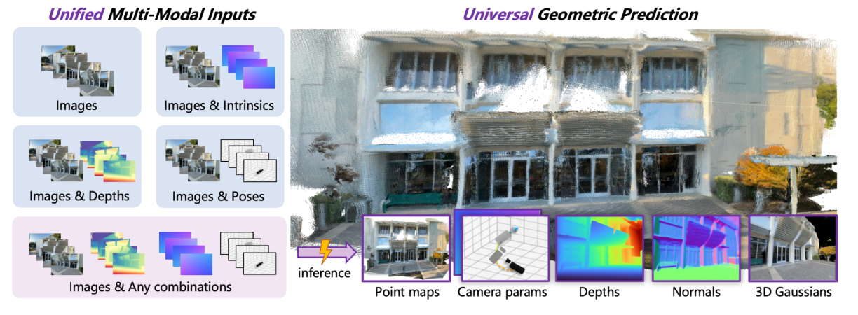它把2D视频变成了可漫游的3D场景统一前馈大模型,支持任意多模态先验,端到端输出点云、深度、相机、法线、3D高斯,秒级推理,单卡部署