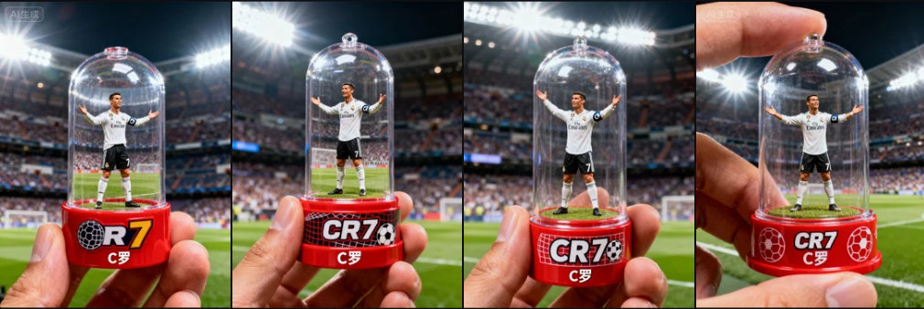 一个精致透明的Gashapon胶囊立体模型,夹在手指间,展示了C罗以他的标志性庆祝张开双臂呈现。内部:短发、白色皇马球衣、黑色短裤、佩戴CR7袖标,背景元素如伯纳乌球场。灯光应具戏剧性和电影感,与主题相匹配(耀眼白光)。胶囊顶部透明,底座有彩色(红色),装饰有与人物相关的图案(CR7字母+足球网格)。底部标注为C罗,字体样式相匹配(硬朗无衬线体)。设计应呈现出微型收藏品的风格,拥有逼真的细节、柔和散景和方形1080x1080的构图。