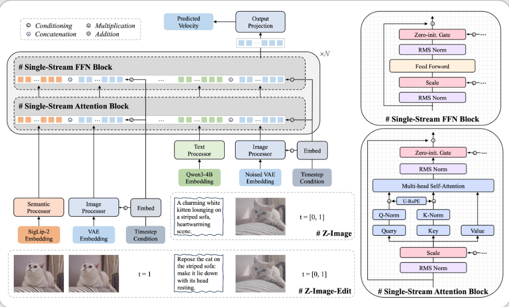传统图像生成模型通常使用双流架构(文本流 + 图像流),而 Z-Image 将文本、视觉语义标记以及图像 VAE 标记统一处理为单一输入流。这种 单流处理 极大提高了参数效率,同时降低了计算与显存开销。